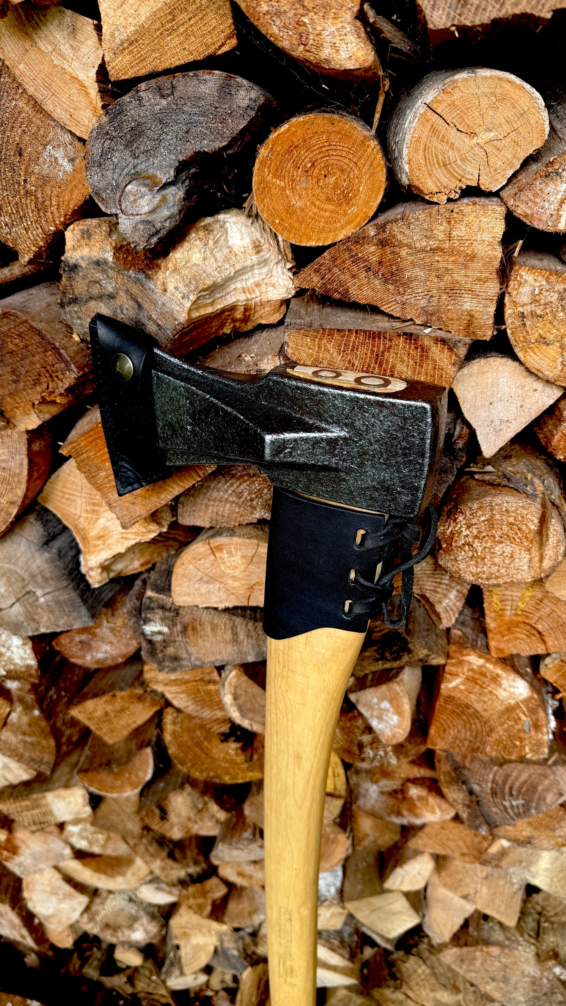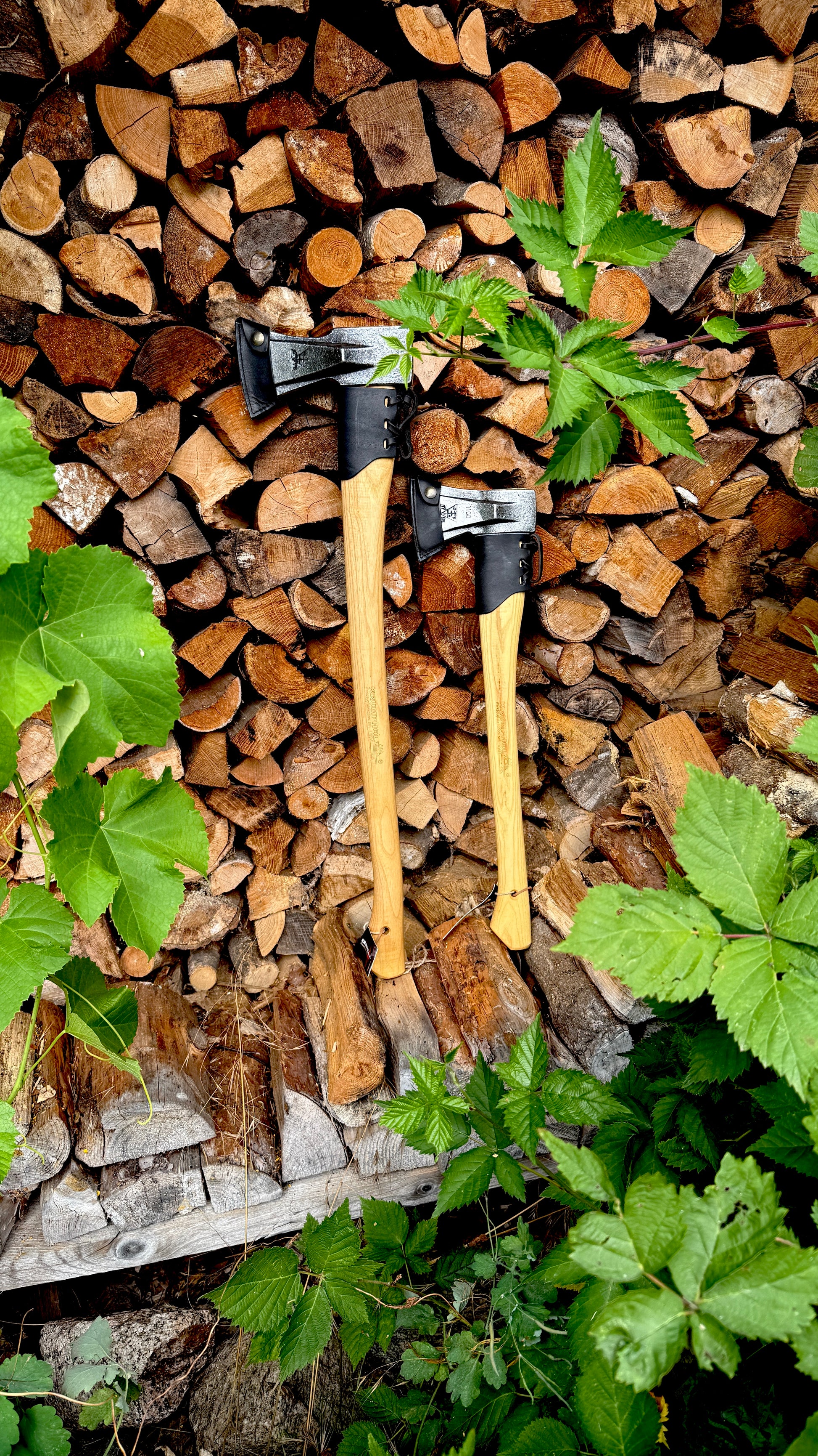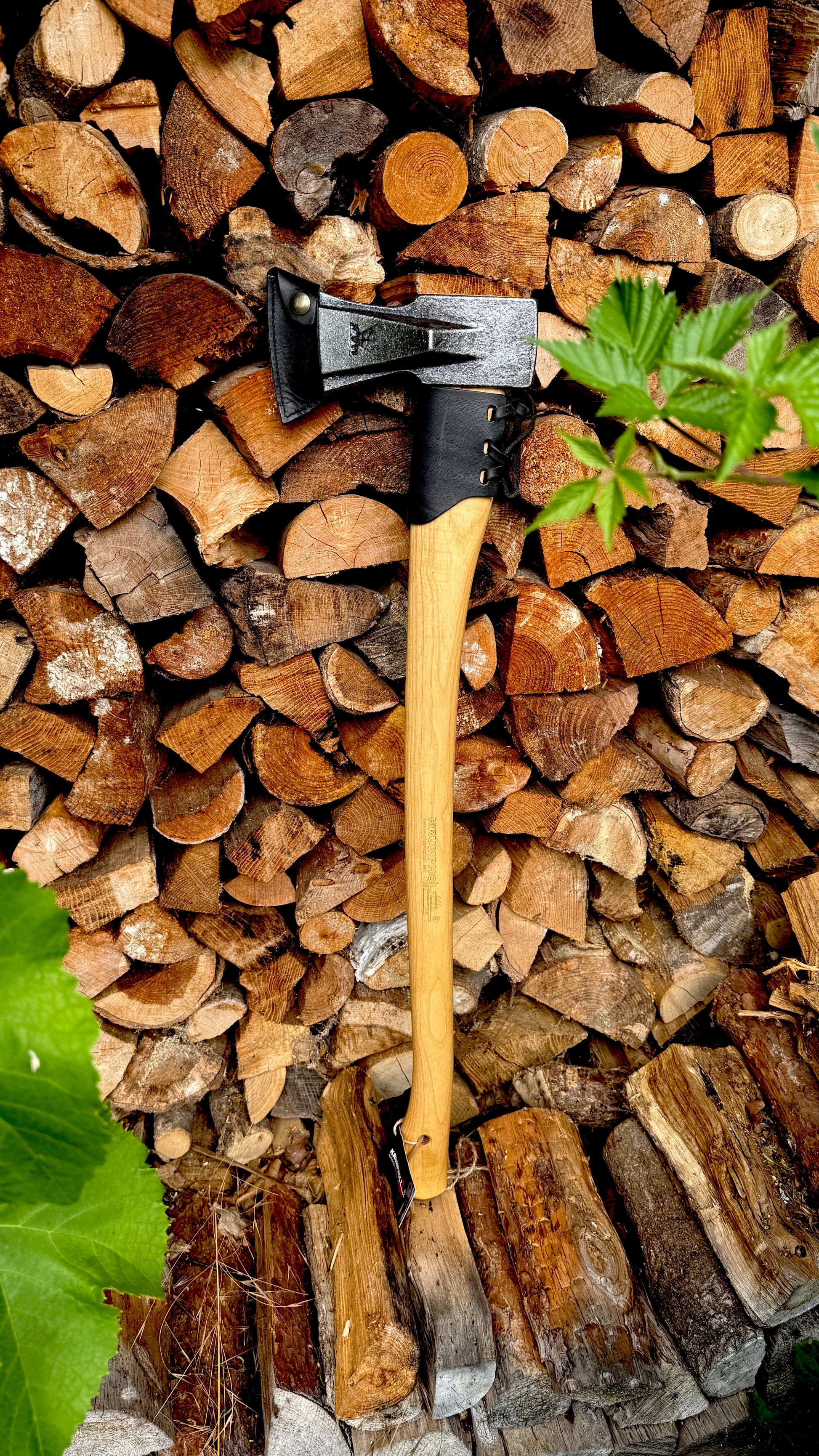 The Krumpholz Super Splitting Axe 364 combines traditional craftsmanship with functional precision. Equipped with an 80 cm long cow foot handle made of ash (optionally also made of extremely robust hickory with leather protection) and a hand-forged, hardened steel head, it is ideal for splitting firewood. The high wedge angle in combination with the clear lacquered blade ensures effortless penetration and effective spreading of the wood.
