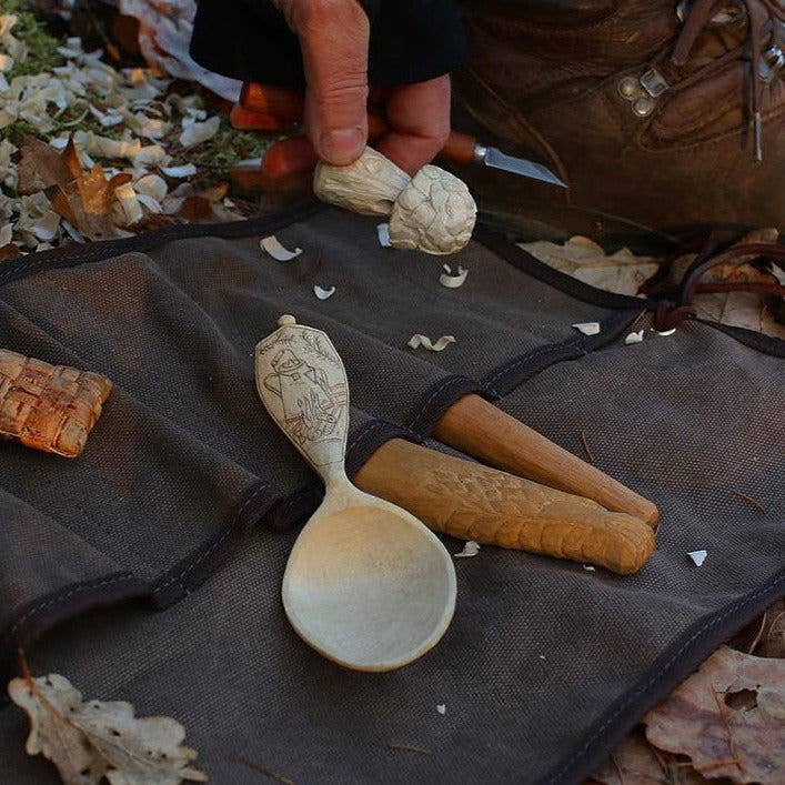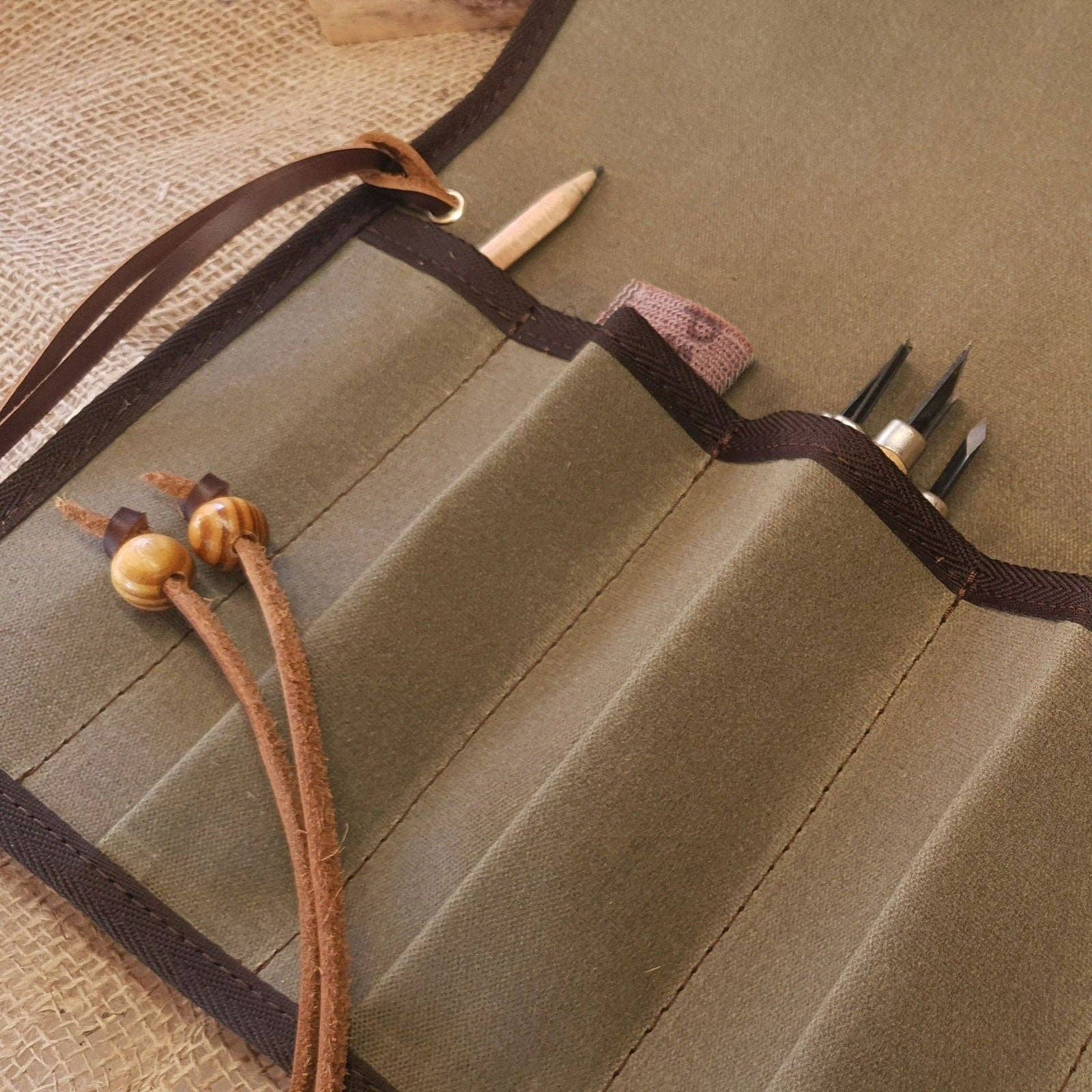 Keep your carving tools protected and portable with this tool roll made from heavy-duty 16oz cotton canvas. This tool roll is made from 16oz cotton canvas to last and withstand years of heavy use. It's double-stitched with very strong, water- and rot-resistant nylon thread. It's finished with vegetable-tanned leather drawstrings for durability and wooden buttons for easy fastening.