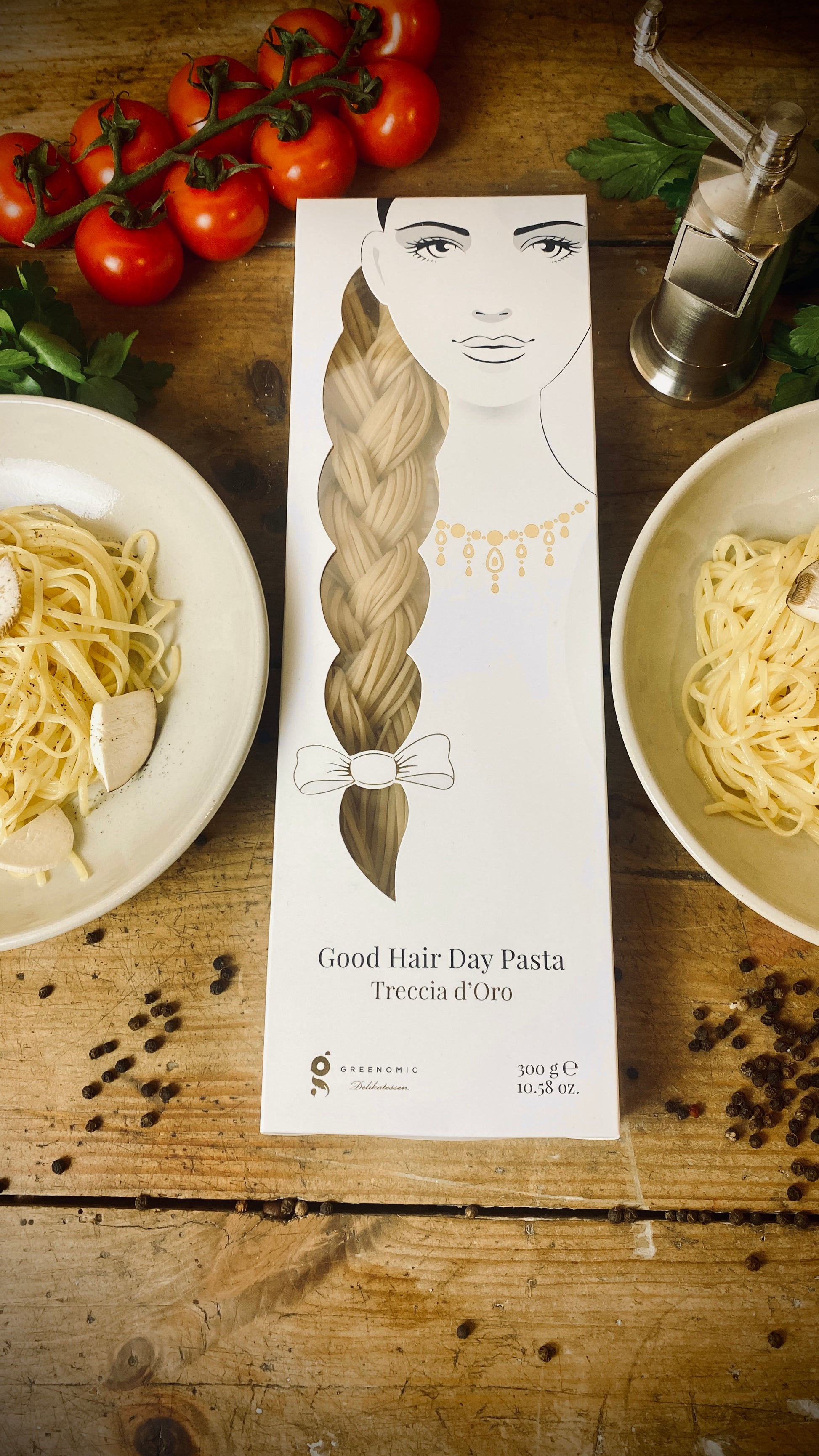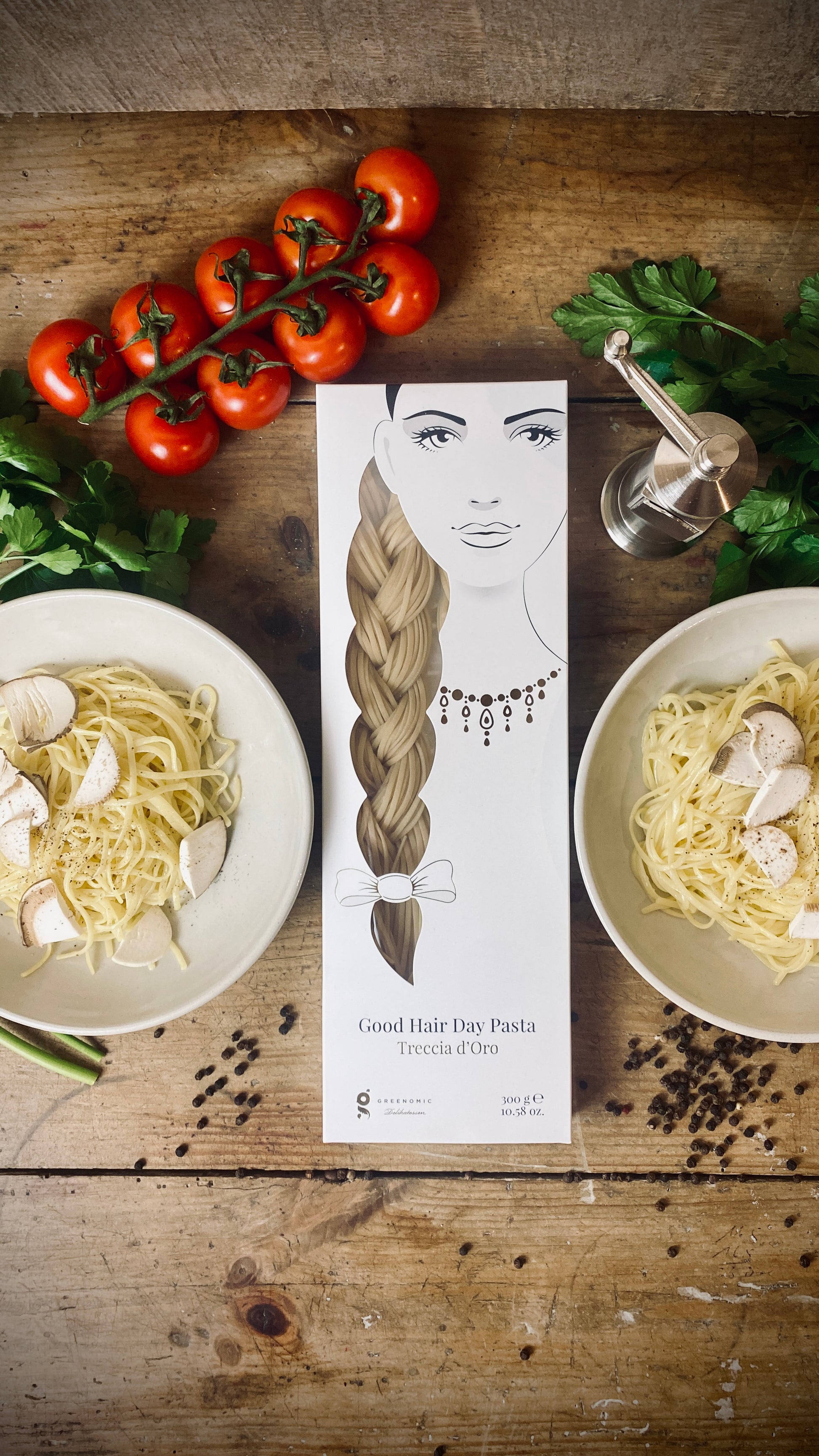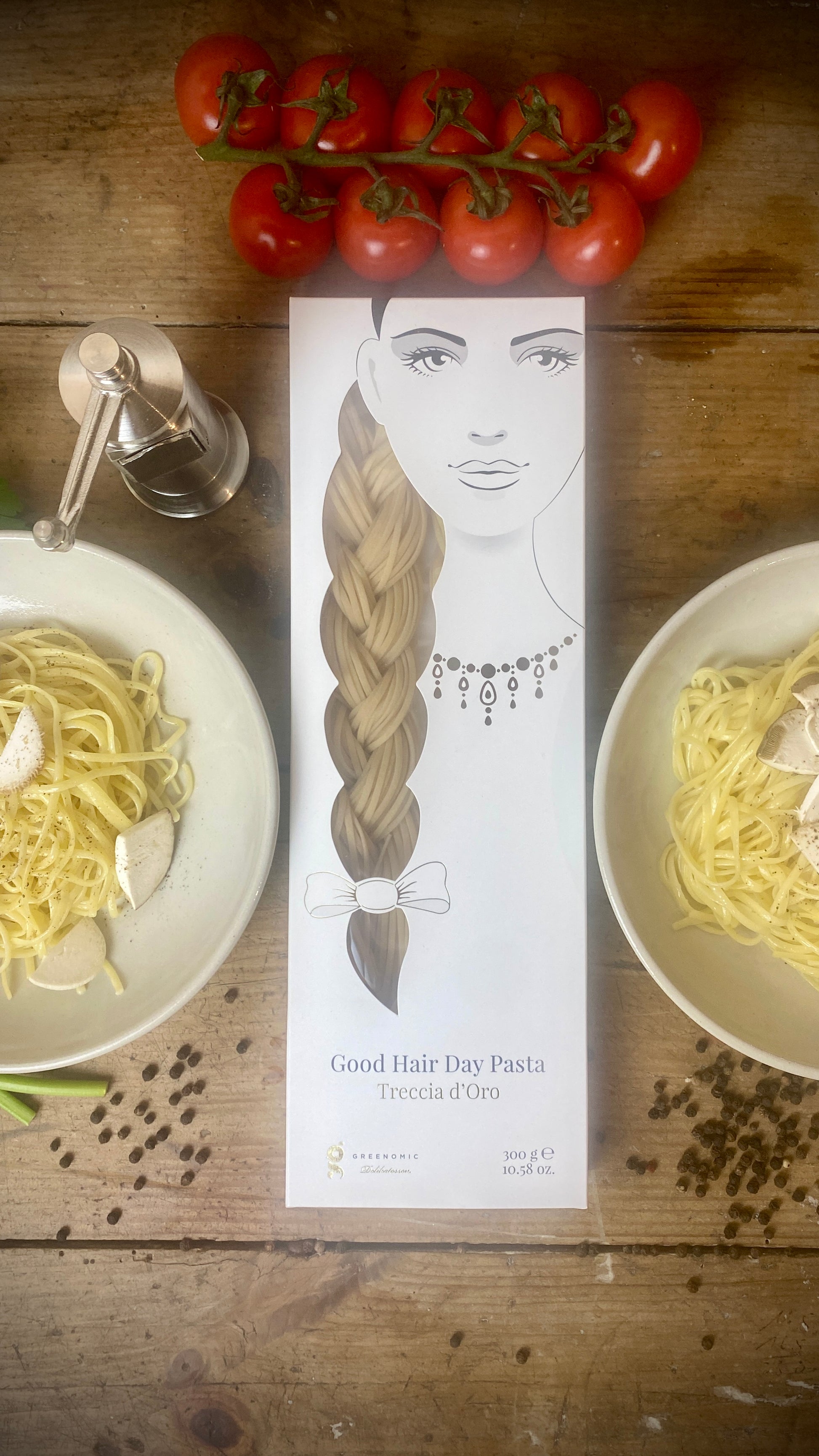 A very special gift set of GREENOMIC delicacies Good Hair Day Spaghetti Treccia d'Oro and two hand-made pasta plates from Atelier Andrea.