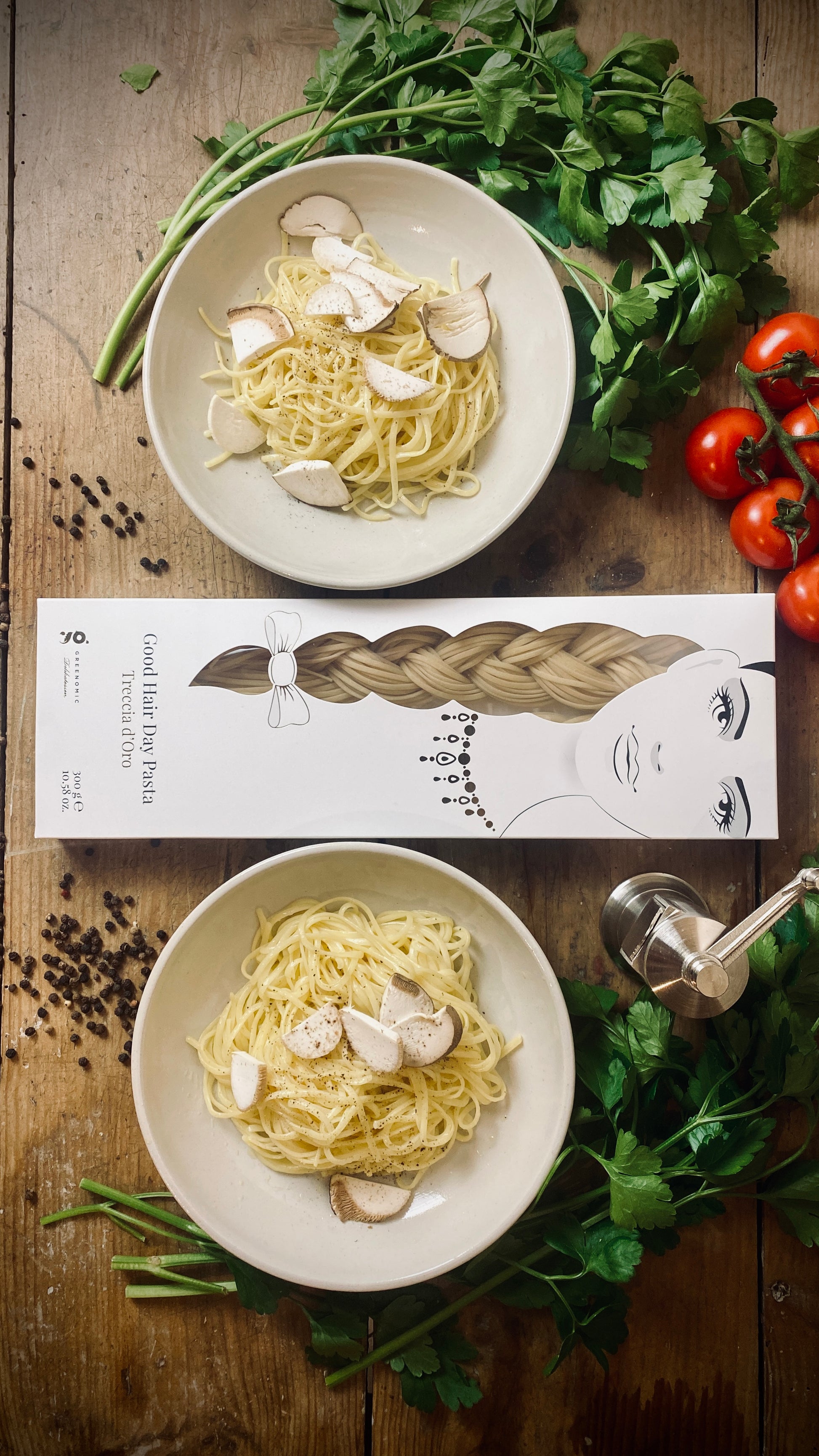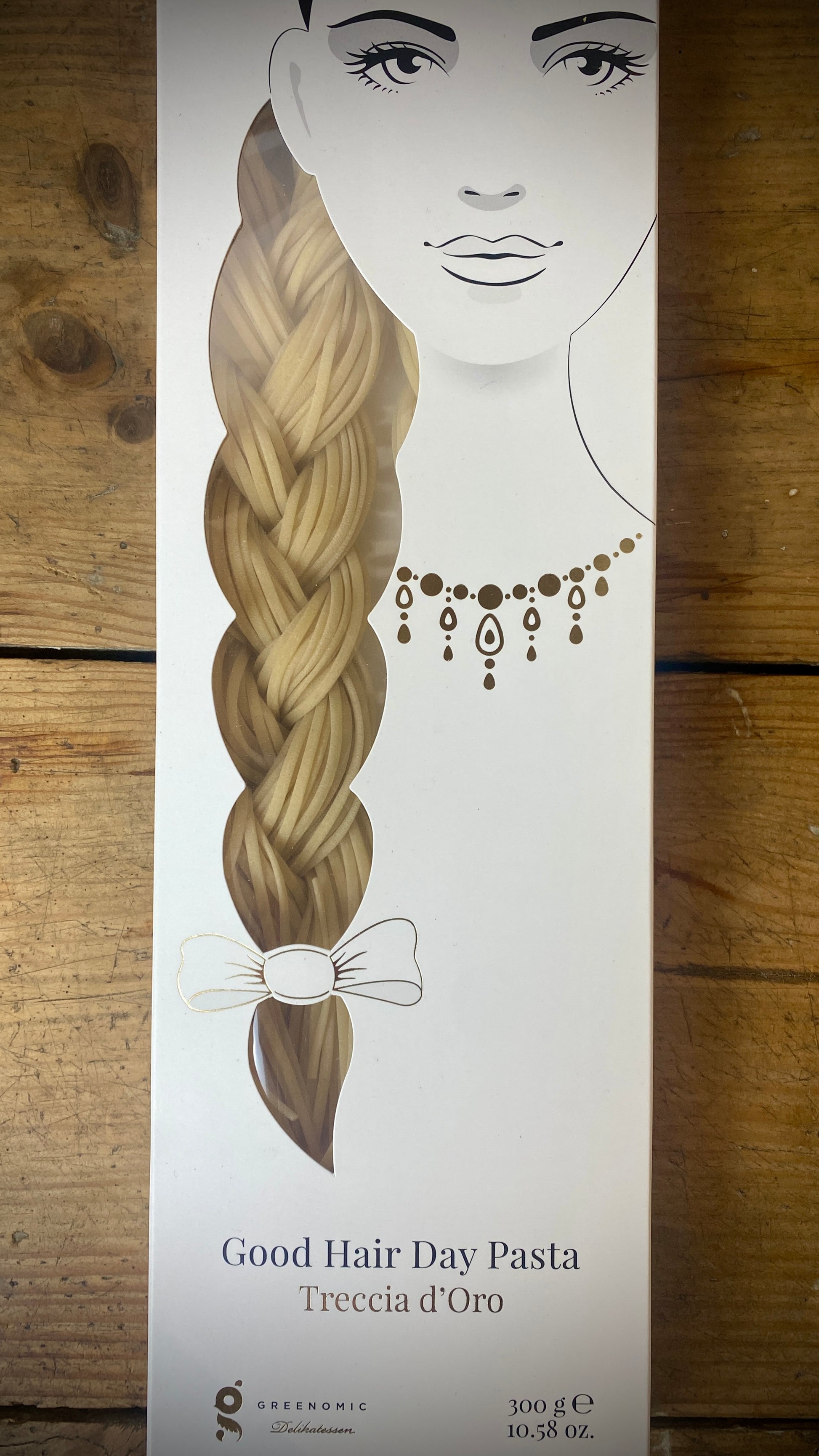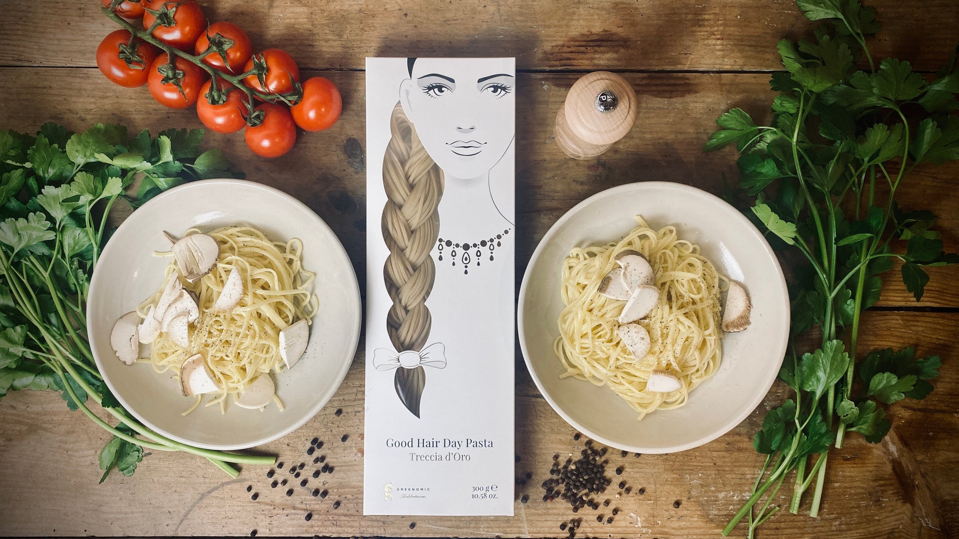 A very special gift set of GREENOMIC delicacies Good Hair Day Spaghetti Treccia d'Oro and two hand-made pasta plates from Atelier Andrea.