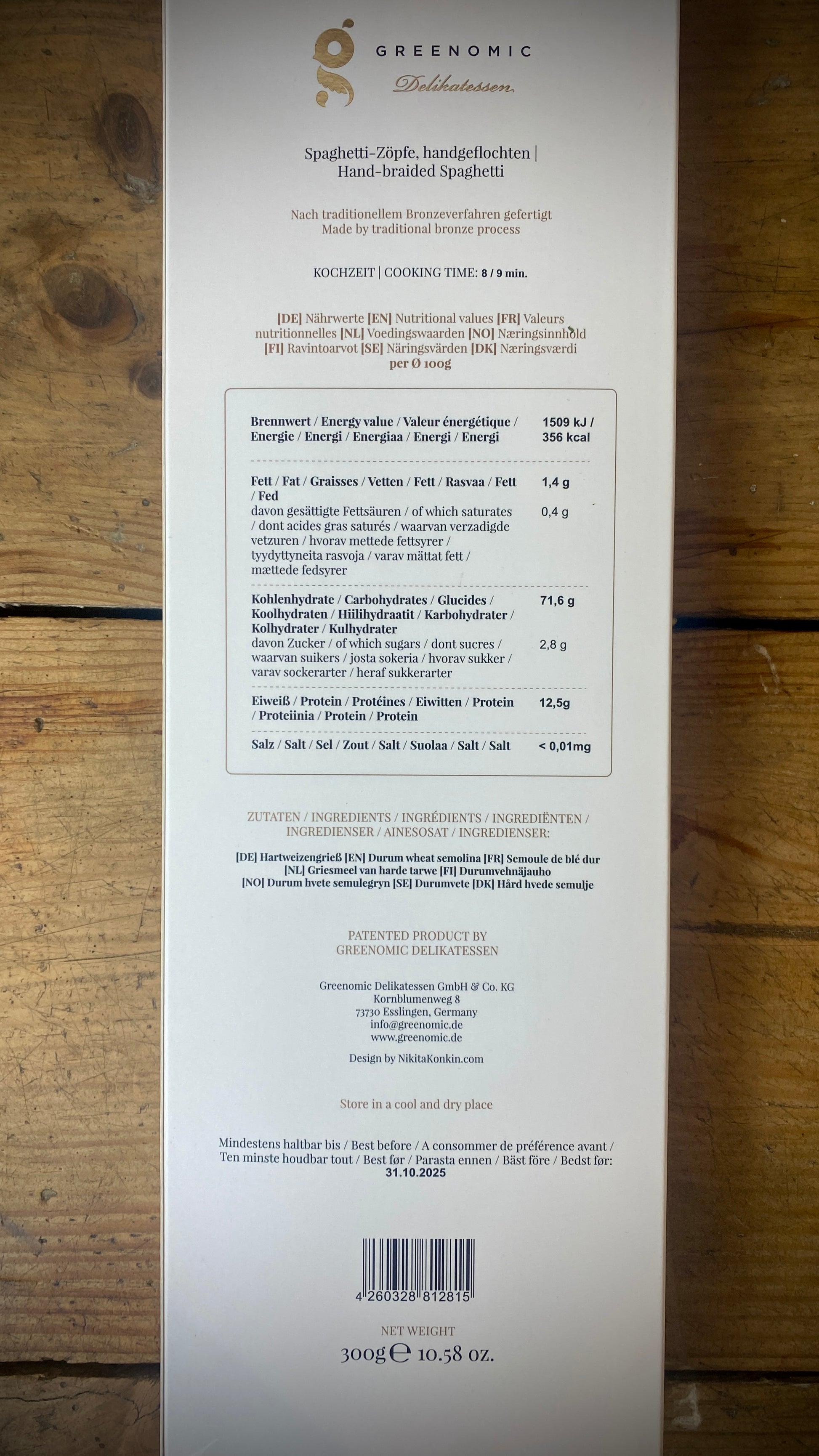 Discover a new way to enjoy pasta: Our original Italian spaghetti is artfully braided into two plaits. "Al bronzo" spaghetti is distinguished by its ability to absorb sauces and seasonings particularly well. The packaging design is by award-winning designer Nikita Konkin.