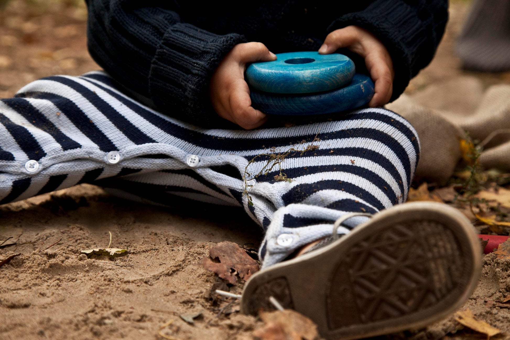 Die farbenfrohen Holzringe rollen sanft über den Boden und lassen sich immer wieder neu anordnen. So entstehen spielerisch erste Erfahrungen mit Formen, Größen und Balance, begleitet von ruhigem, konzentriertem Spiel.