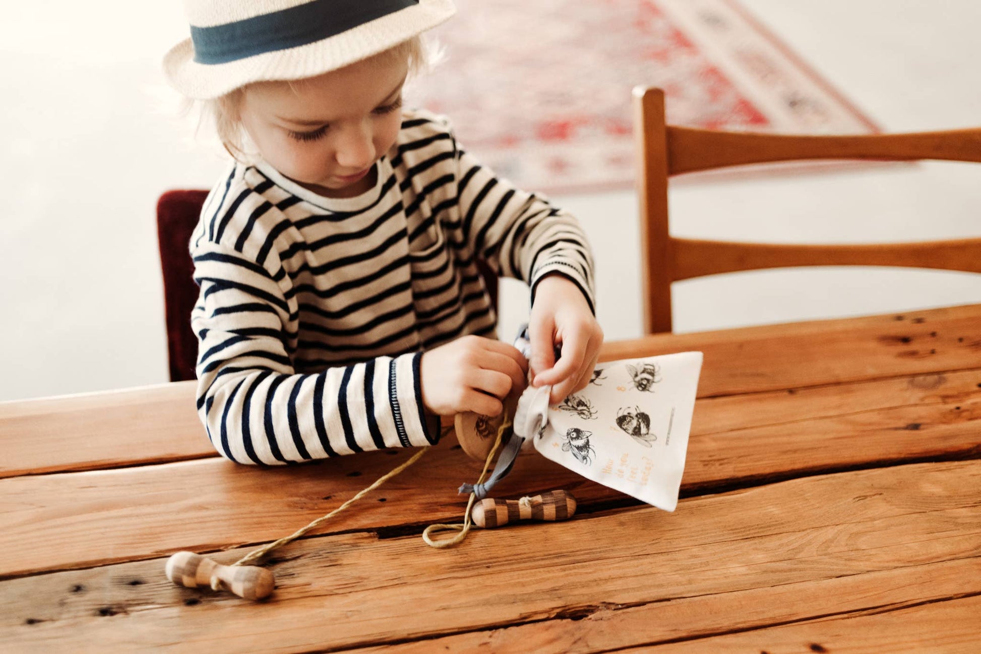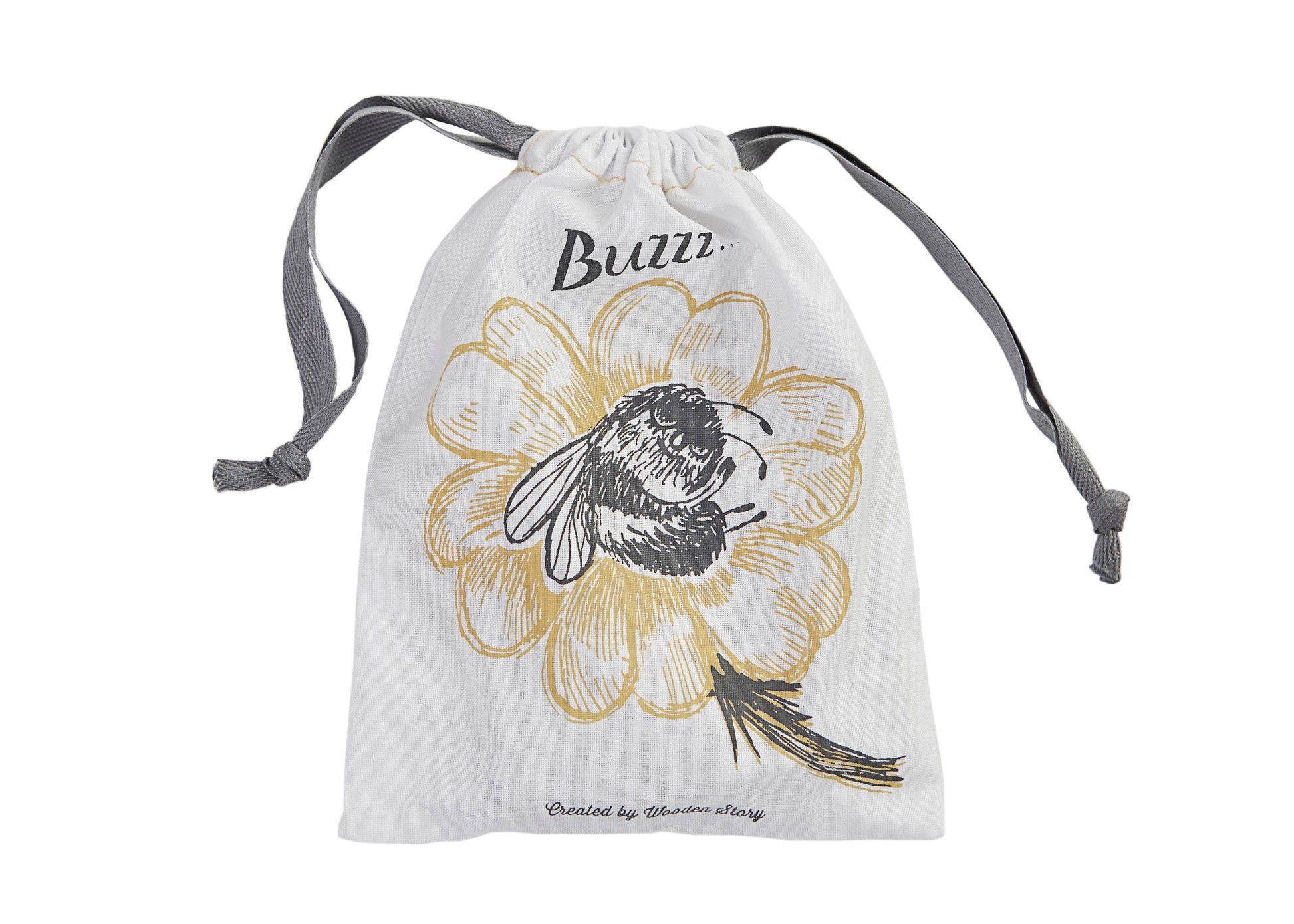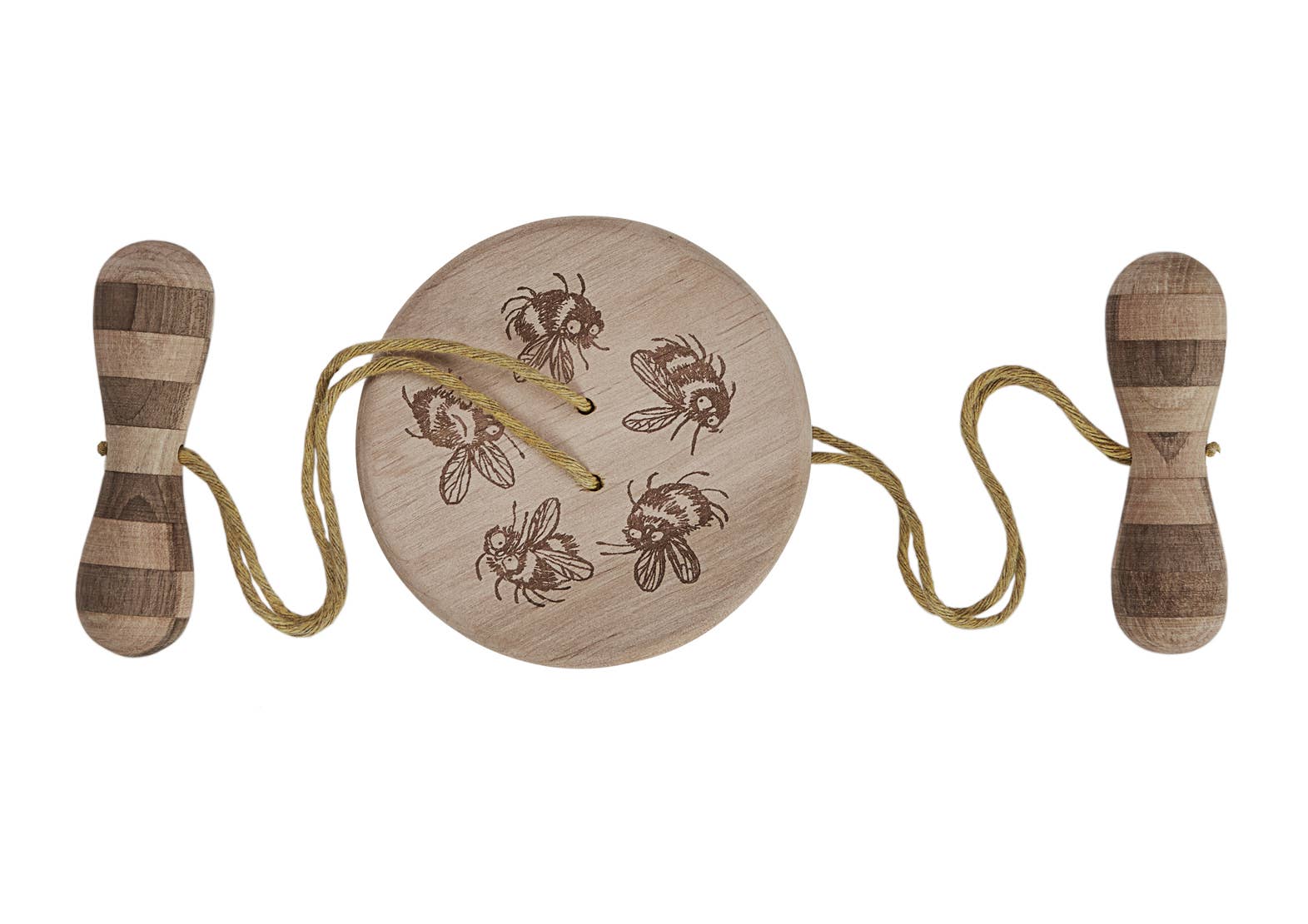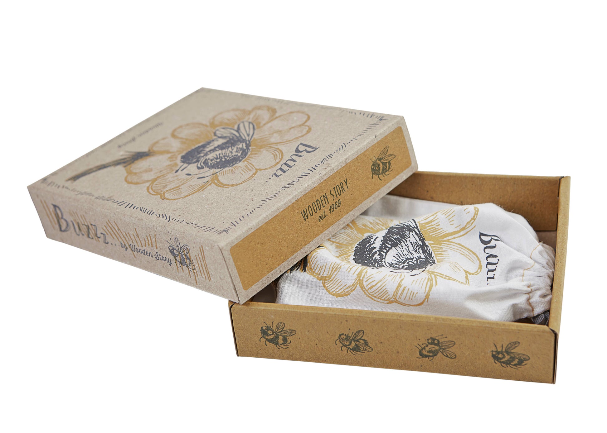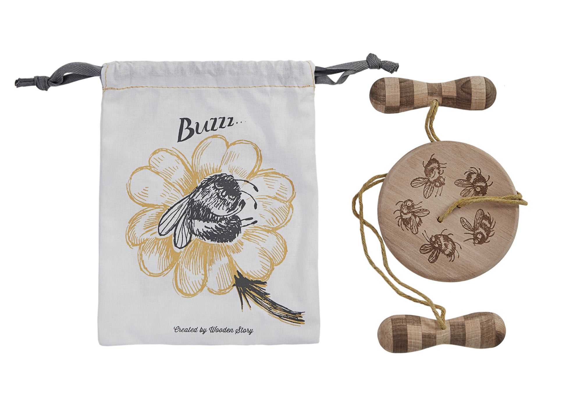 Die Holzscheibe ist mit fröhlichen Hummeln verziert und spricht gezielt die Sinne an. Beim Drehen entsteht ein summendes Geräusch, das an den tänzelnden Flug von Bestäubern erinnert. Das Spiel fördert Konzentration, Feinmotorik und das Verständnis für Ursache und Wirkung.
